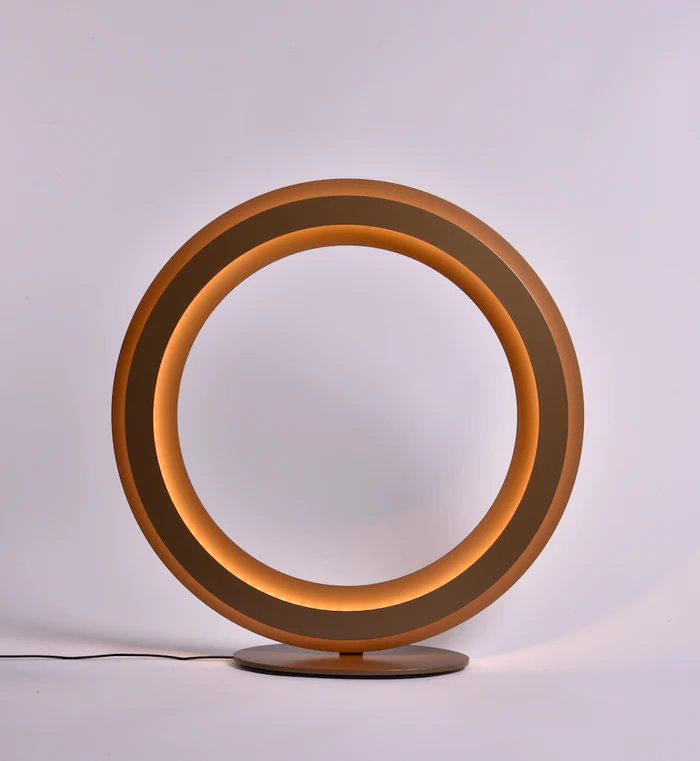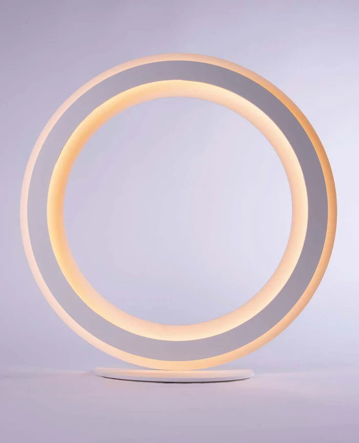 Une lampe circulaire au design épuré, diffusant une lumière indirecte douce et chaleureuse.