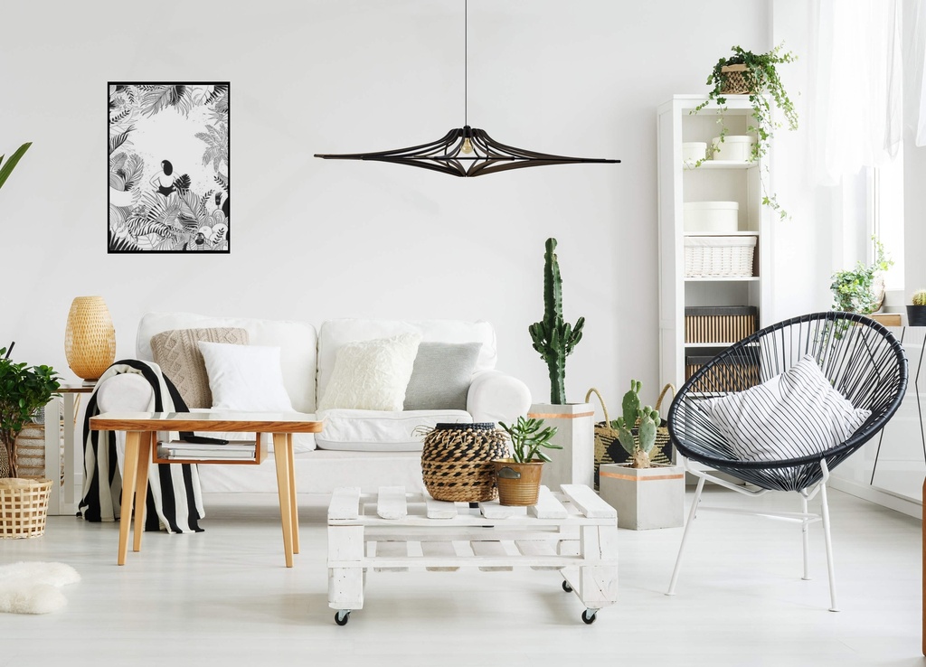 Une suspension grand format à l’élégance graphique. Bois noir mat et lignes sculpturales pour une pièce forte au style contemporain.