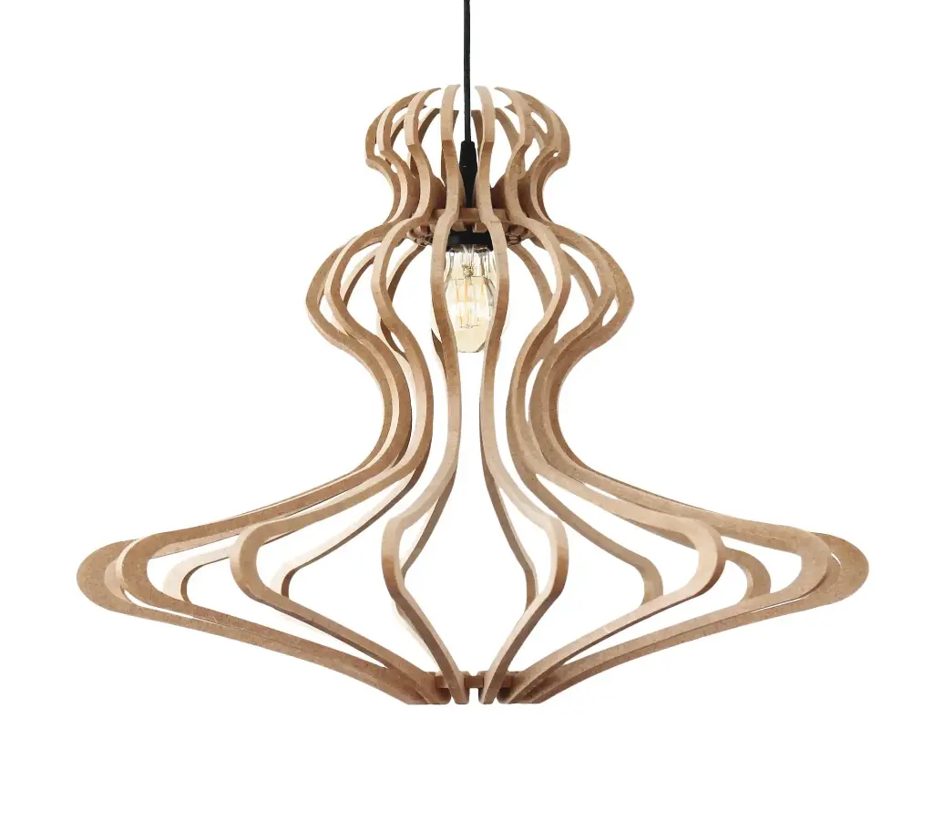 Une suspension sculpturale aux courbes généreuses, en bois recyclé, pour une lumière douce et une ambiance chaleureuse.